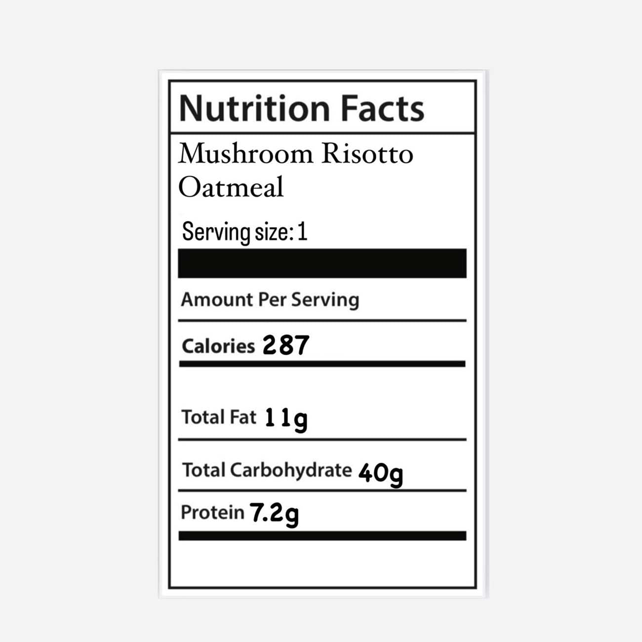 ريزوتو الشوفان بالفطر وجبة نباتية لذيذة ومشبعة، مثالية في أي وقت من اليوم. تتكون من الشوفان الساخن، والفطر، والكراث، ومرق الخضار، ومسحوق الثوم، والملح، والفلفل، وسبعة أنواع من التوابل، وزيت الزيتون الأسود، وخميرة غذائية. هذه الوجبة الخالية من الغلوتين قليلة السعرات الحرارية وغنية بالنكهة والقيمة الغذائية.