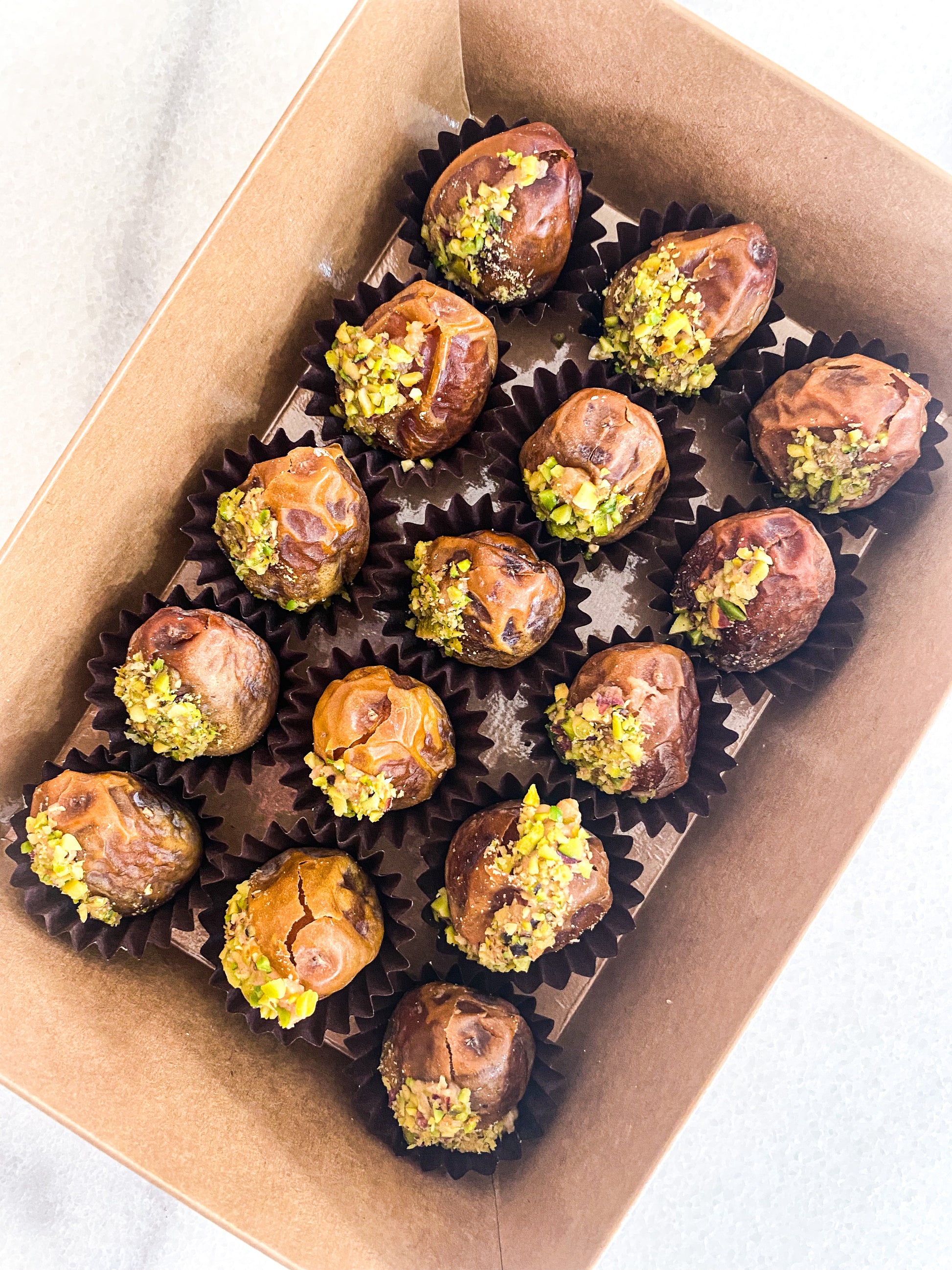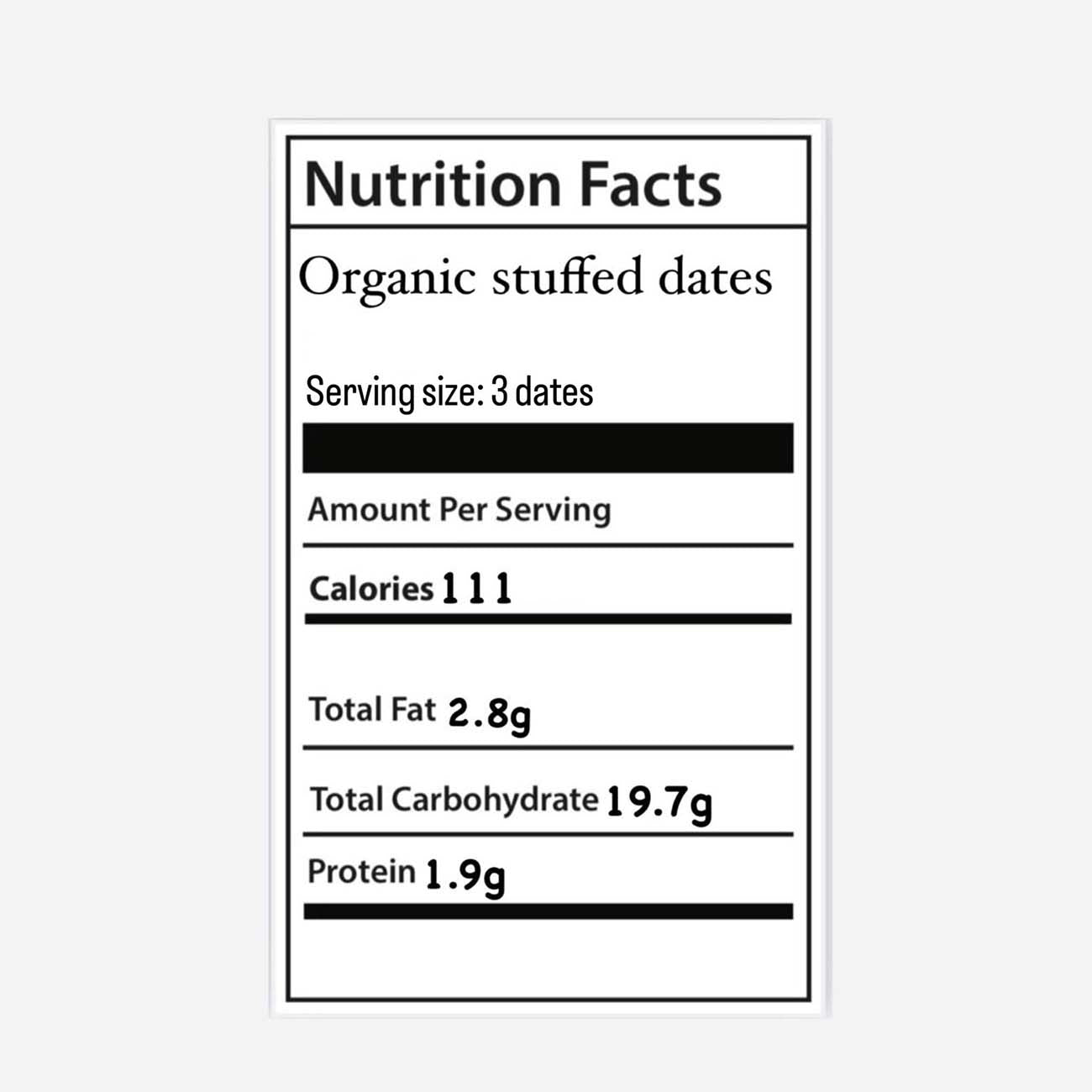 التمر العضوي المحشو بزبدة الفول السوداني والطحينة وشراب القيقب مع الفستق الحلبي منتج لذيذ وصحي. يتميز هذا المنتج بمكونات عضوية فاخرة، وهو خالٍ من الغلوتين ومناسب للنباتيين.