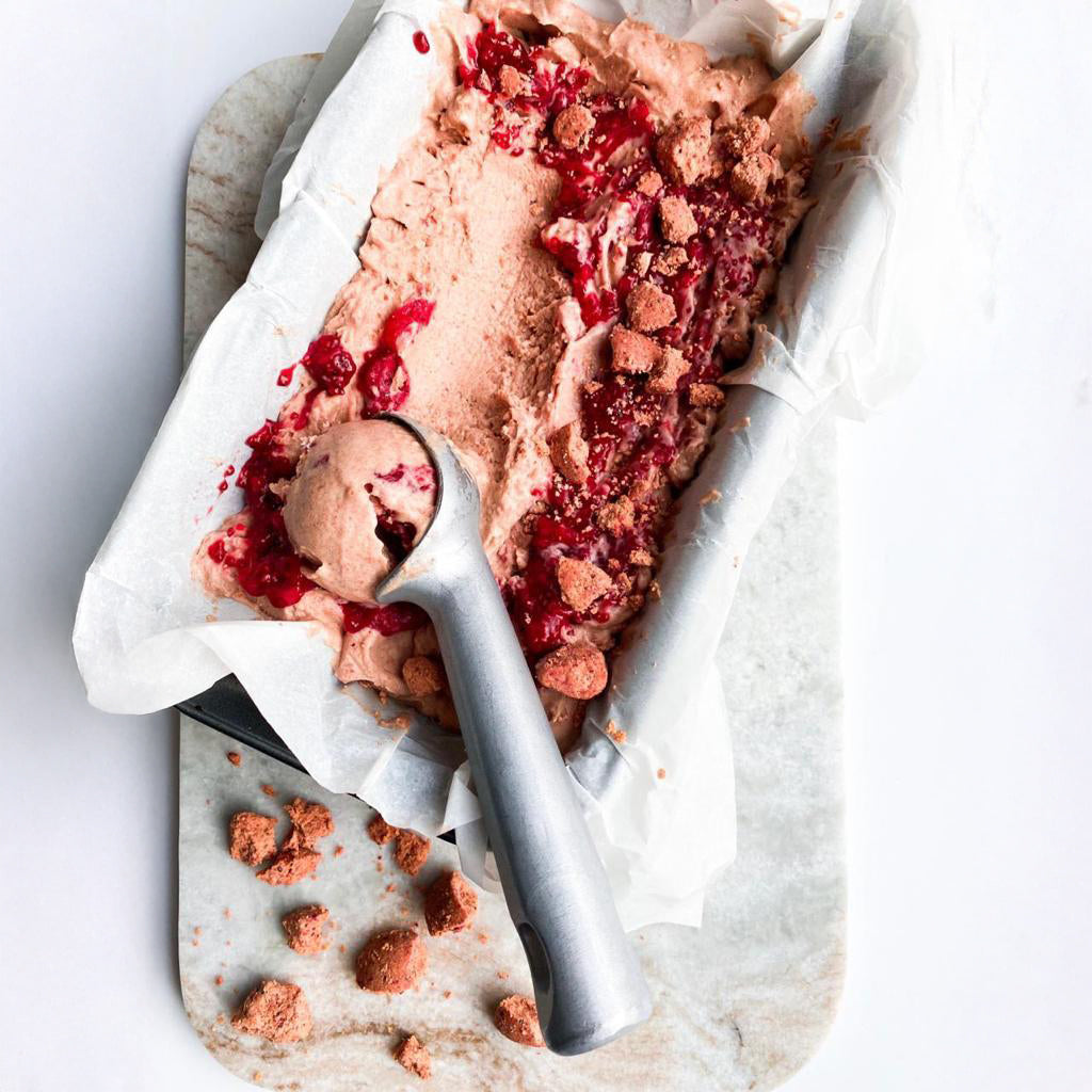 حلوى مجمدة خالية من منتجات الألبان، صحية ولذيذة، بنكهة فراولة غنية ممزوجة بمربى الشيا. قوام كريمي ناعم من جوز الهند محلى بالتمر، ومُعزز بكرات الفراولة الغنية بالبروتين.